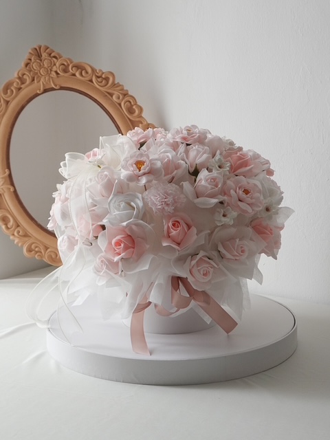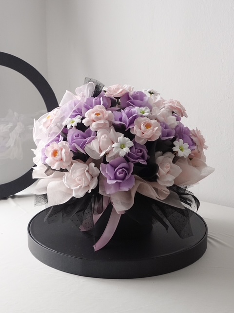 he Eternal Blush Luxury Soap Flower Bouquet is crafted with exquisite soft pink soap roses, thoughtfully arranged to create a full, graceful, and timeless look. Finished with premium wrapping, delicate layers, and a satin pink ribbon, this bouquet reflects elegance and refined beauty.